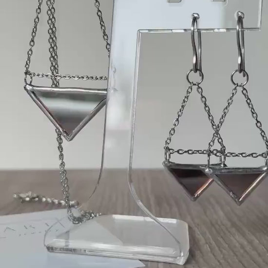 Handmade mirror triangle earrings with a modern geometric design. Each earring is crafted from real mirror, cut into a downward-pointing triangle and soldered with a tin-based alloy for strength and durability.