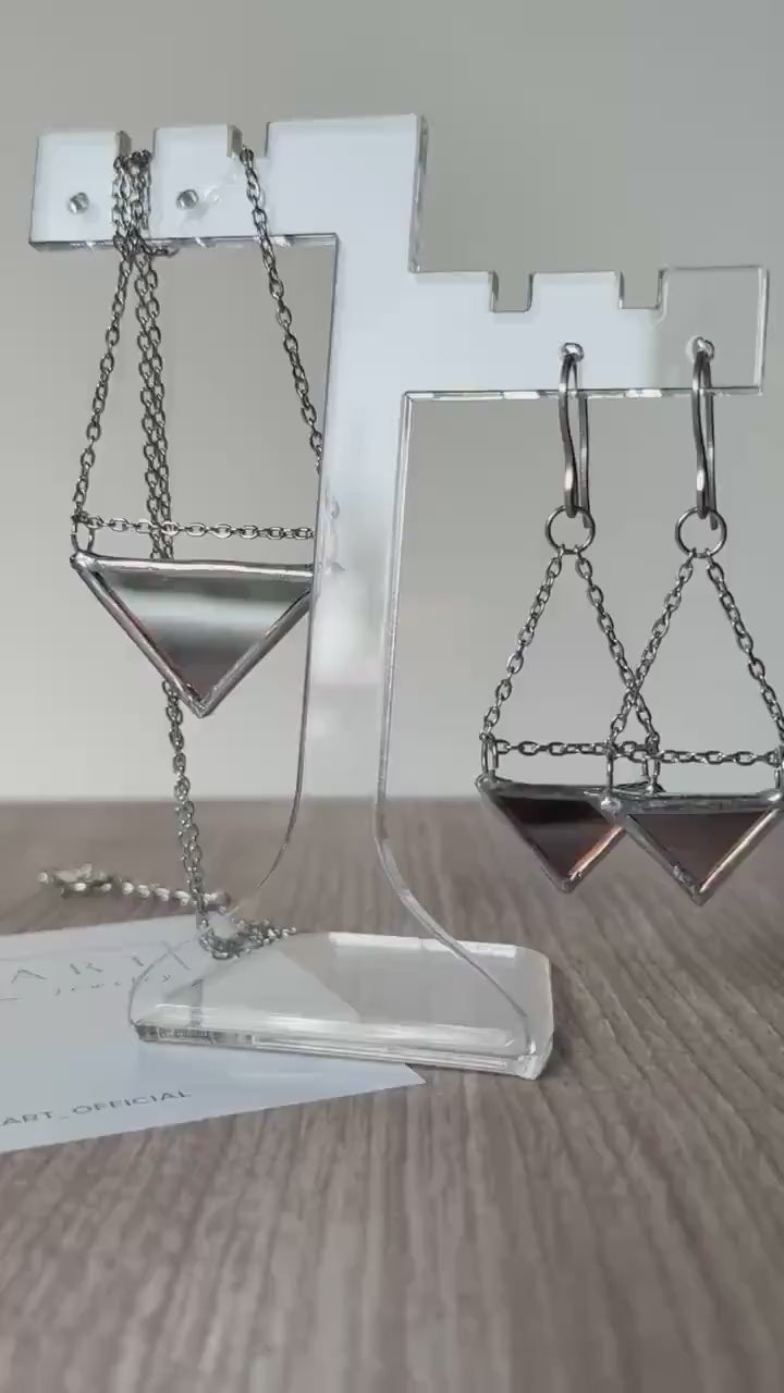 Double-Sided Mirror Triangle Earrings, Geometric Dangle Earrings on Chain, Handmade Reflective Jewelry, Stainless Steel Hooks